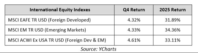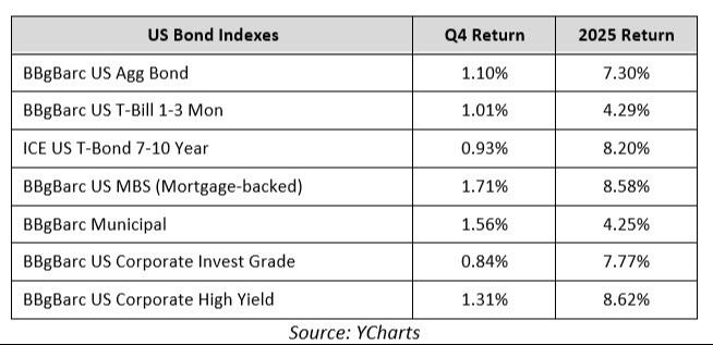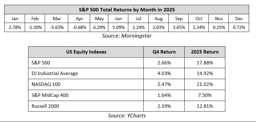 On a sector level, performance in the fourth quarter was mixed, as eight of the 11 S&P 500 sectors finished the fourth quarter with a positive return. However, for the second straight year, all 11 sectors ended the full year with gains. The healthcare sector was, by far, the best performer in the fourth quarter thanks generally to investors rotating towards more value-oriented sectors of the market, but also because fears that the prolonged government shutdown would lead to reduced federal healthcare spending went unfulfilled, and that boosted the outlook for healthcare stocks going forward. For the full year, technology and communication services sectors were the top performers, as both sectors benefitted from the substantial gains of AI-linked tech stocks.