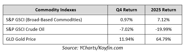 Commodities saw mixed performance in the fourth quarter that largely mirrored the performance for 2025. Gold finished the fourth quarter and year with substantial gains. A weaker U.S. dollar, rising geopolitical tensions, stubbornly firm inflation and concerns about central bank independence all contributed to gold hitting a new all-time high in 2025 and turning in the best annual performance since 1979. Oil prices, meanwhile, declined sharply in the fourth quarter, which caused oil to post a negative annual return for 2025. Despite elevated geopolitical tensions, concerns about global oversupply of oil weighed on prices throughout 2025 and made it one of the few major assets to post a negative return for the year.