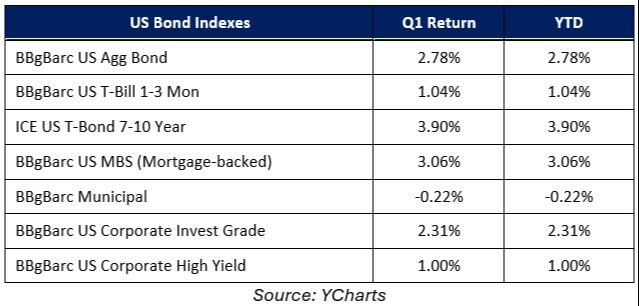 Turning to the corporate bond market, higher-quality but lower-yielding investment-grade bonds outperformed higher-yielding but lower-quality bonds in the first quarter and that reflected investor concerns about future economic growth amidst policy uncertainty. However, both investment-grade and high-yield corporate bonds finished the first quarter with modest gains, reflecting a still present sense of economic optimism from bond investors.