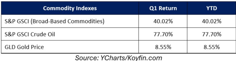 Commodities were generally speaking, sharply higher in the first quarter thanks to the surge in the geopolitical risk premium following the outbreak of the U.S./Iran war. Oil prices hit the highest levels since 2022 thanks to the U.S./Iran war and following Iranian attacks on Gulf oil infrastructure, which further reduced global supply. Gold, meanwhile, hit a new all-time high above $5,000/oz. early in the quarter but finished with just a moderate quarterly gain, as the surging dollar pressured gold prices late in Q1.