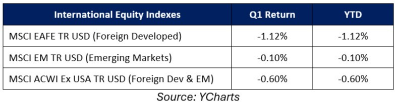 Internationally, foreign markets relatively outperformed the S&P 500 and ended the quarter with only a small decline, despite the surge in geopolitical risks. Emerging markets outperformed both developed markets and the S&P 500 and registered only a fractional loss despite the strong dollar, as the surge in commodity prices was seen as offsetting the rising U.S. dollar. Foreign developed markets declined in Q1, but only modestly, and solidly outperformed U.S. markets thanks mostly to the smaller weighting of tech shares in foreign indices.