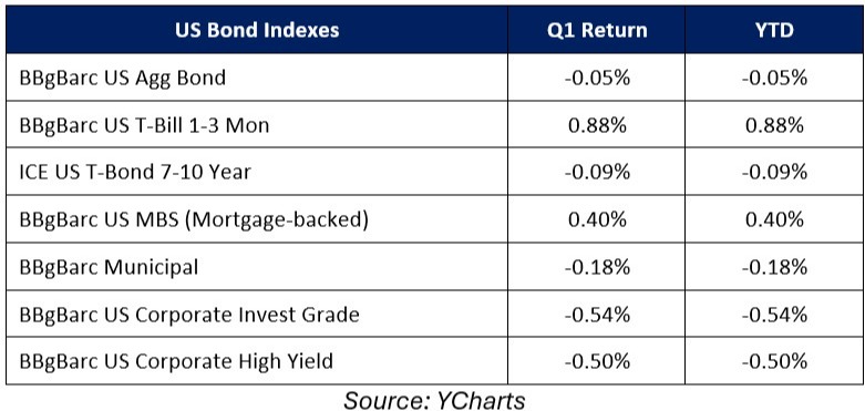 Switching to fixed income markets, the leading benchmark for bonds (Bloomberg Barclays US Aggregate Bond Index) finished the quarter with a slight loss as bonds were solidly higher mid-quarter but declined in March on rising inflation concerns, as surging oil prices and hotter-than-expected inflation readings reduced expectations for Fed rate cuts. Short-term bills modestly outperformed longer-duration bonds and logged a positive return as they are less sensitive to rising inflation risks compared to longer-duration debt.