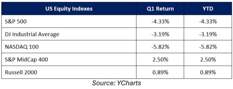 On an index level, the three major large cap stock indices finished the quarter with losses. The Nasdaq was the worst performer among them thanks to weakness in AI-related tech and software stocks. Small caps, however, relatively outperformed large caps as the Russell 2000 finished the first quarter with a small gain, as small-cap stocks are generally viewed as more insulated from the headwinds of the first quarter (i.e., geopolitical tensions, private credit worries, AI concerns).